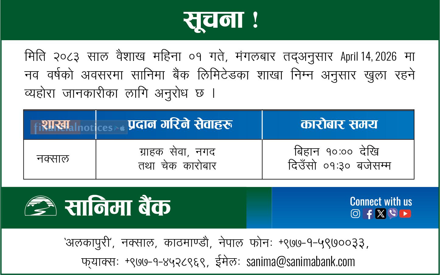 नयाँ वर्षको दिन सानिमा बैंकको शाखाहरु खुल्ला रहने सम्बन्धी सूचना