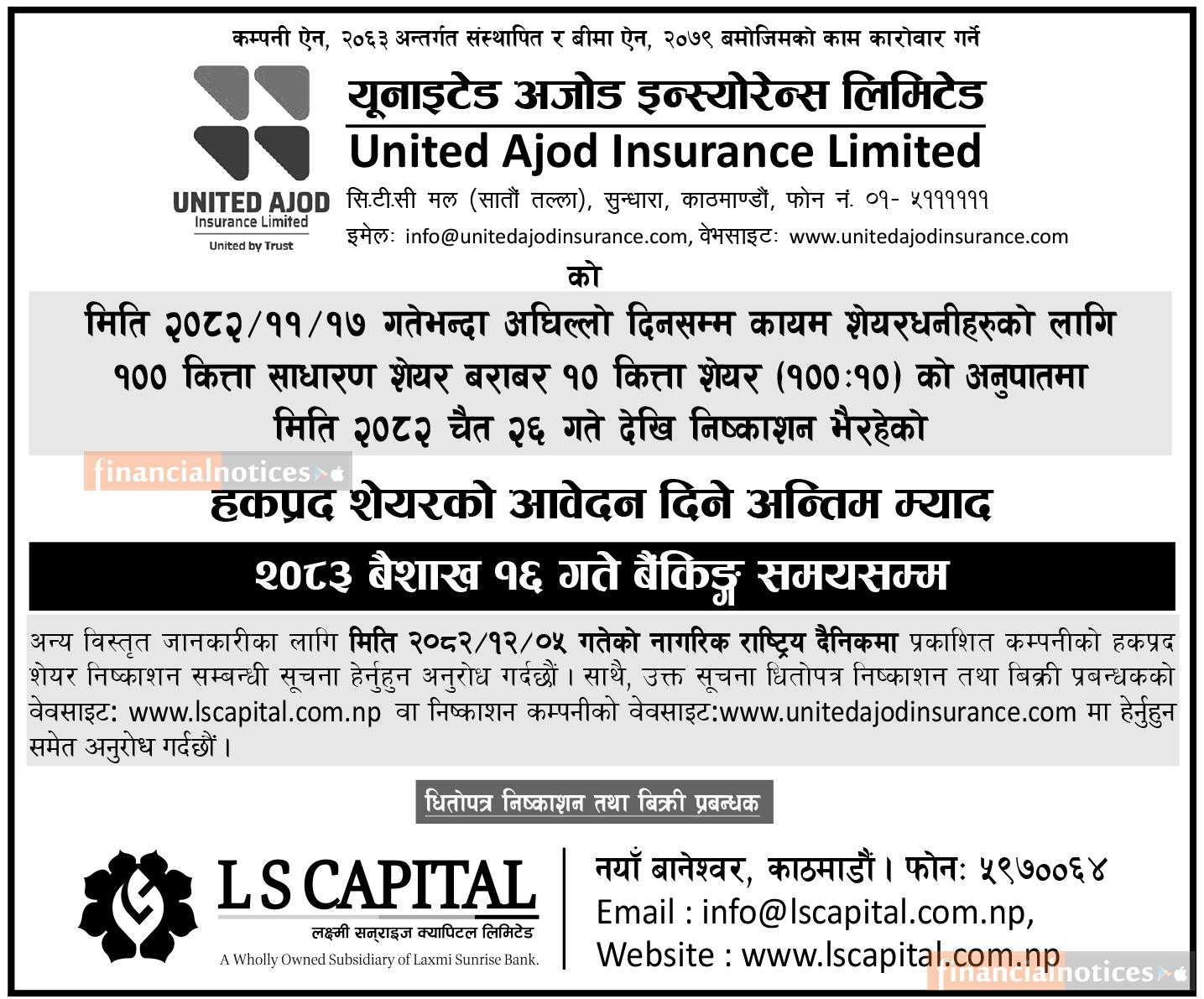 United Ajod ईन्स्योरेन्सको हकप्रद सेयरमा वैशाख १६ गते सम्म आवेदन दिन सकिने सम्बन्धी सूचना