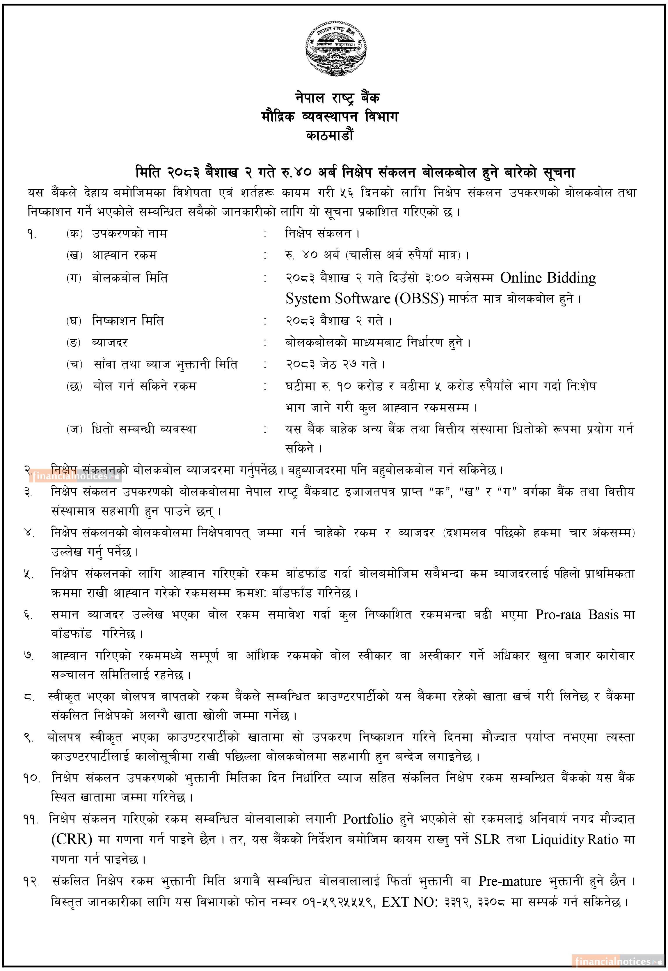 बैंकिङ प्रणालीमा बढी तरलता, नेपाल राष्ट्र बैंक ले ५६ दिने निक्षेप उपकरणमार्फत ४० अर्ब उठाउँदै