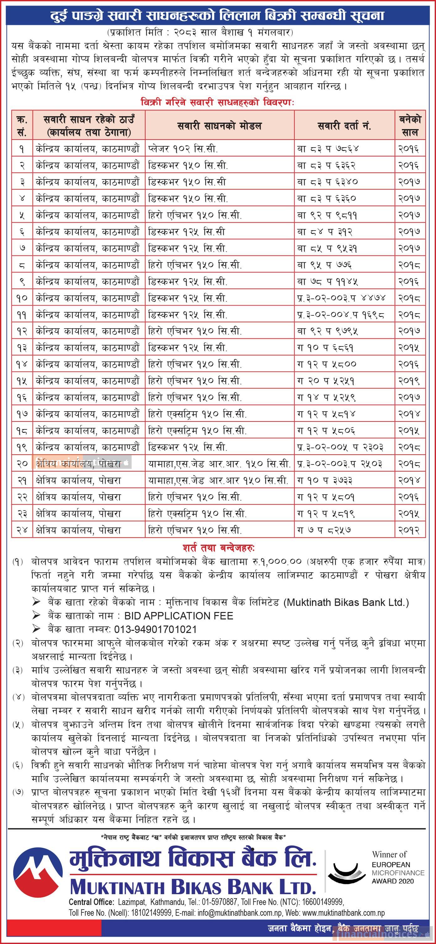 Muktinath Bikas Bank Ltd. has issued a public notice for the auction sale of repossessed two-wheeler vehicles held at its Kathmandu head office and Pokhara regional office. Interested individuals, firms, and institutions are invited to submit sealed bids within 15 days from the notice publication date. Applicants must deposit a non-refundable application fee of NPR 1,000 in the bank’s designated account and comply with the stated terms and conditions. The vehicles will be sold on an “as-is, where-is” basis, and successful bidders must complete the purchase process as per the bank’s guidelines.