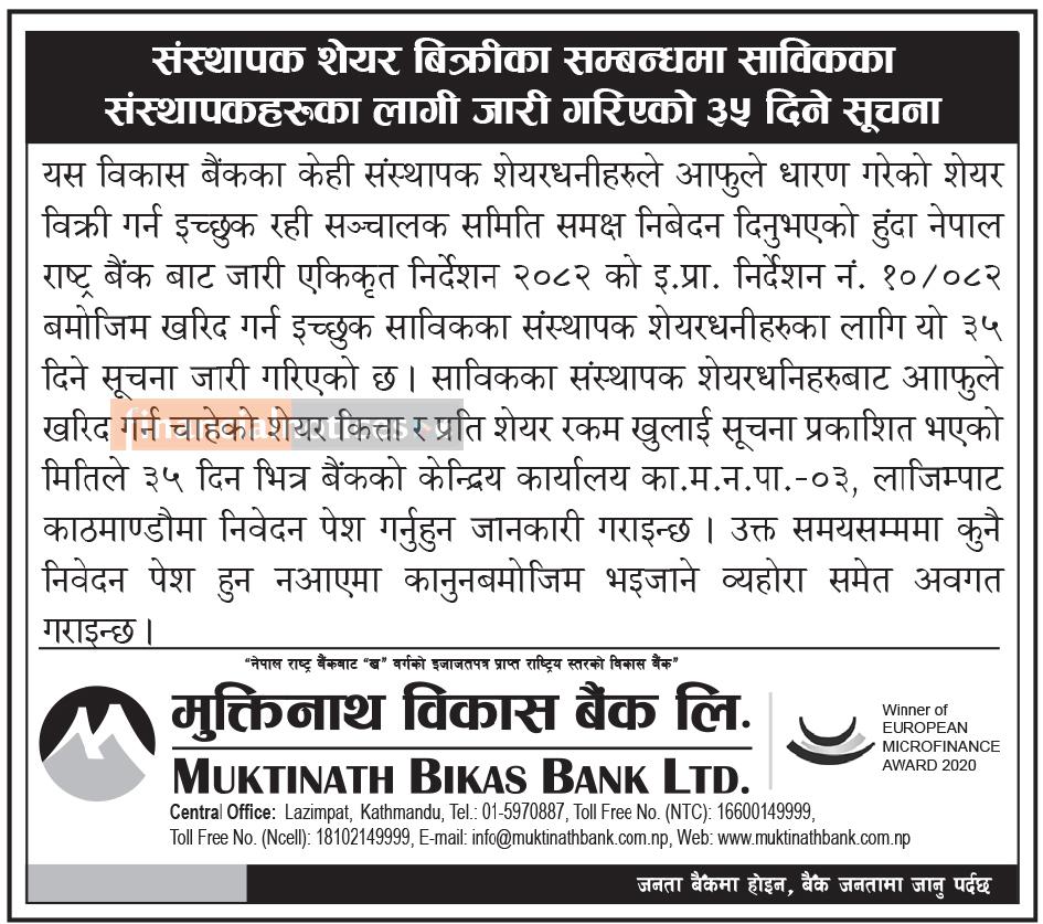 मुक्तिनाथ विकास बैंकका संस्थापक शेयर बिक्री खुला, इच्छुकलाई ३५ दिनभित्र आवेदन आह्वान