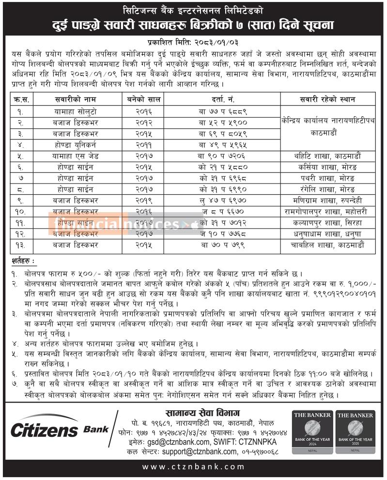 दुई पाङ्ग्रे सवारी साधनहरु बिक्रीको ७ दिने सूचना
