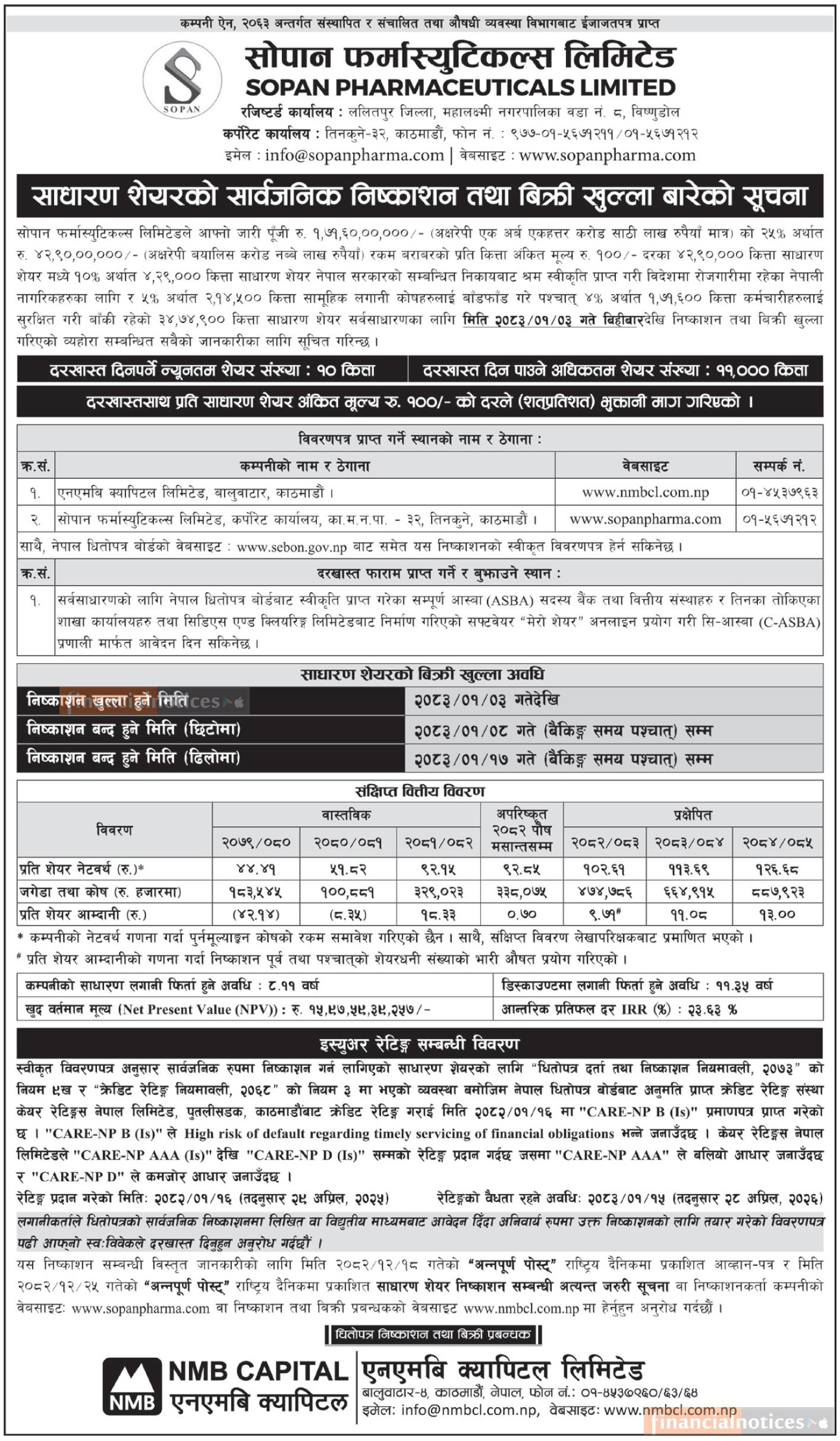 सोपान फर्मास्यूटिकल्सको ४२.९० लाख कित्ता आईपीओ खुला, आजबाट आवेदन दिन सकिने