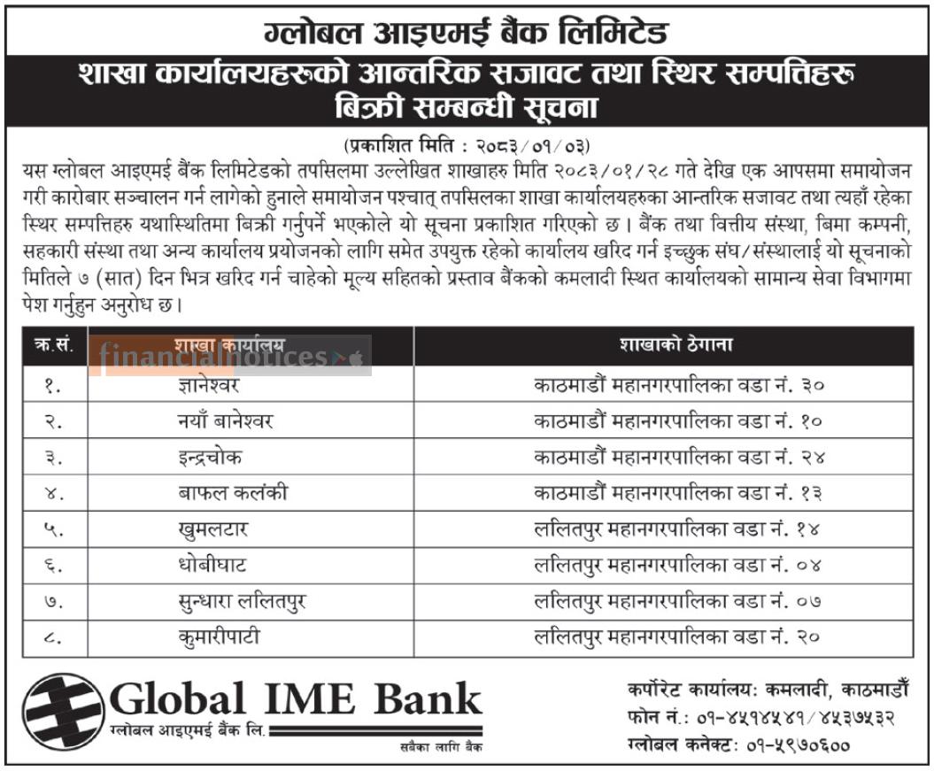 शाखा कार्यालयहरुको आन्तरिक सजावट तथा स्थिर सम्पत्तिहरु लिलाम बिक्री सम्बन्धी सूचना