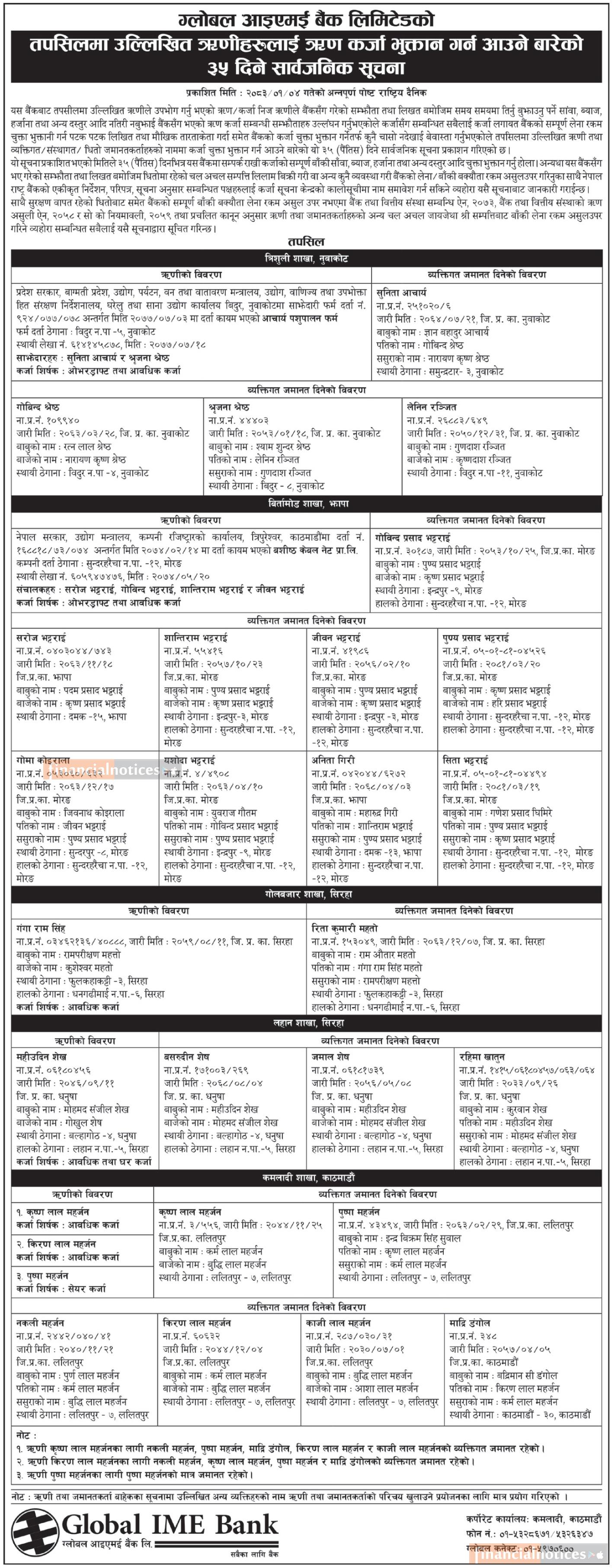 ऋणकर्जा भुक्तान गर्न आउने बारेको ३५ दिने सार्वजानिक सूचना