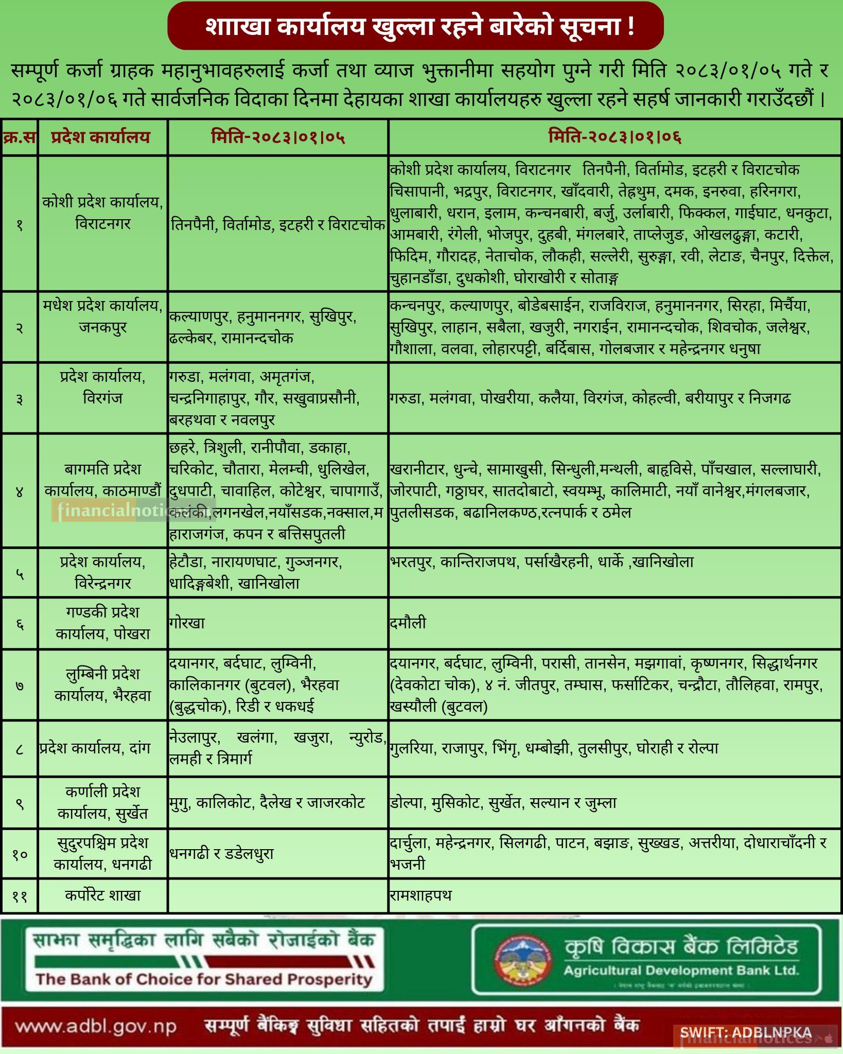 कृषि विकास बैंककाे शाखा कार्यालय खुल्ला रहने बारेकाे सूचना -