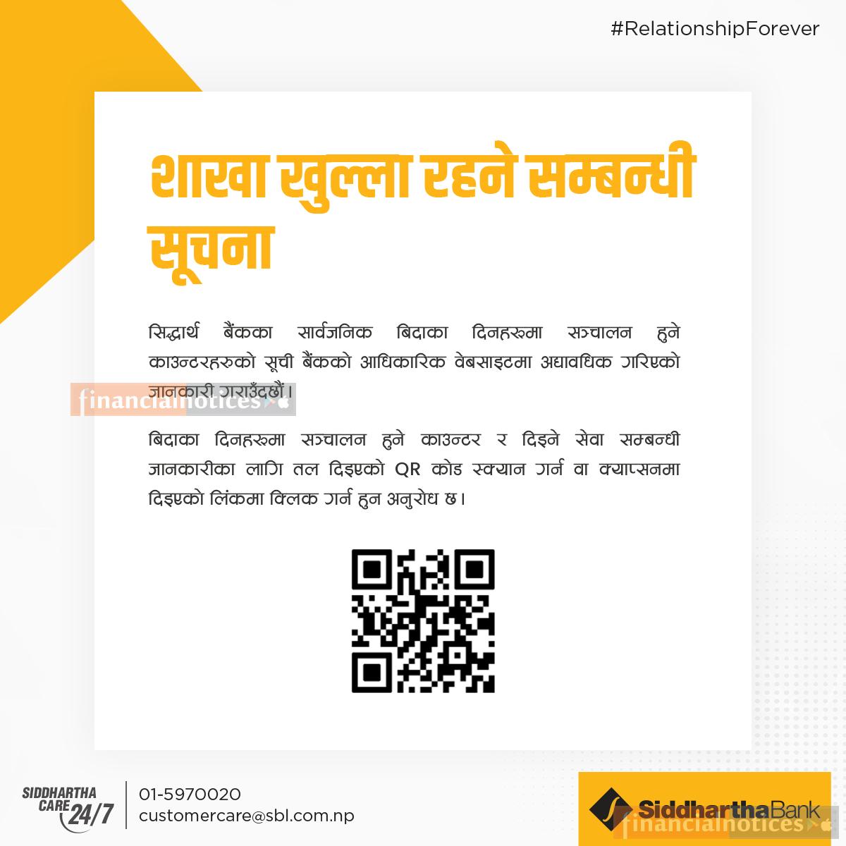 बिदाका दिनहरूमा सञ्चालन हुने काउन्टरहरू सम्बन्धी सिद्धार्थ बैंककाे सूचना -
