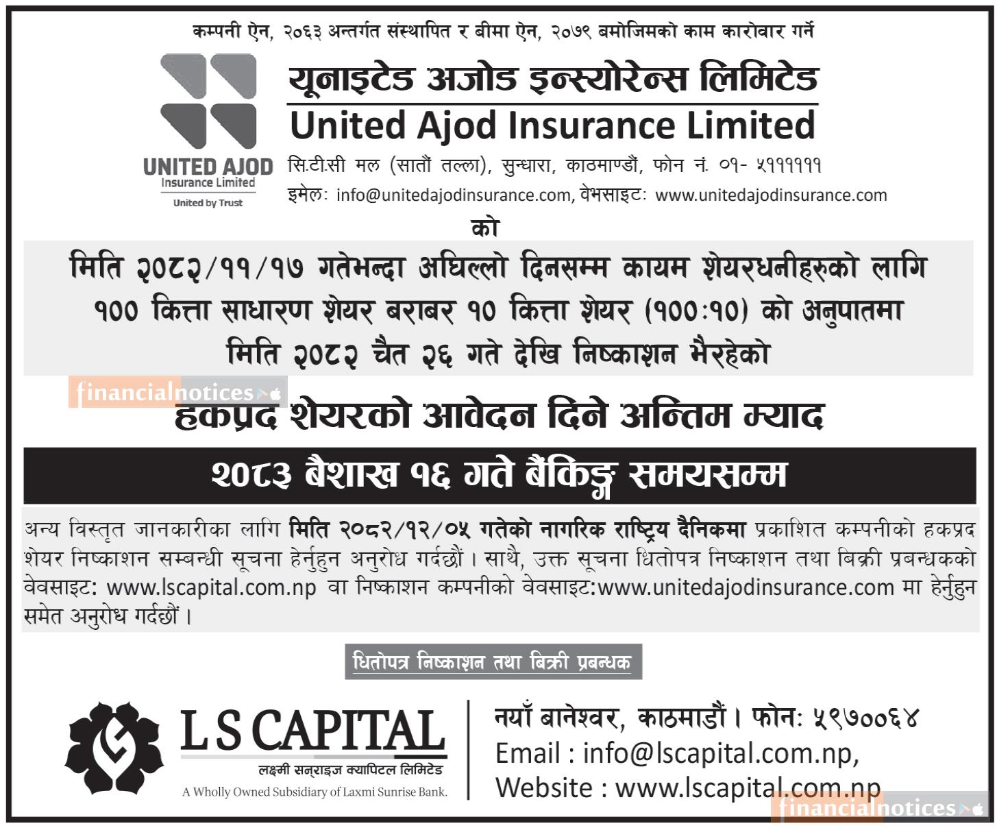 युनाइटेड अजोड इन्स्योरेन्सको हकप्रद सेयरमा वैशाख १६ गते सम्म आवेदन दिन सकिने सम्बन्धी सूचना
