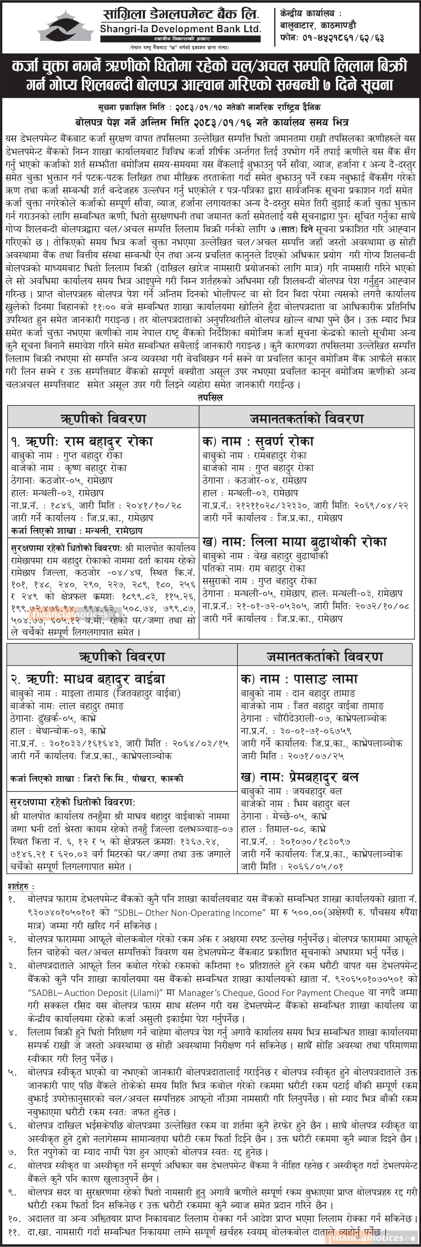 कर्जा चुक्ता नगर्ने ऋणीको धितोमा रहेको चल अचल सम्पत्ति लिलाम बिक्रीको ७ दिने सूचना -