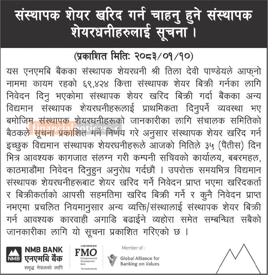 संस्थापक शेयर खरिद गर्न चाहानुहुने संस्थापक शेयरधनीहरुलाई जरुरी सूचना