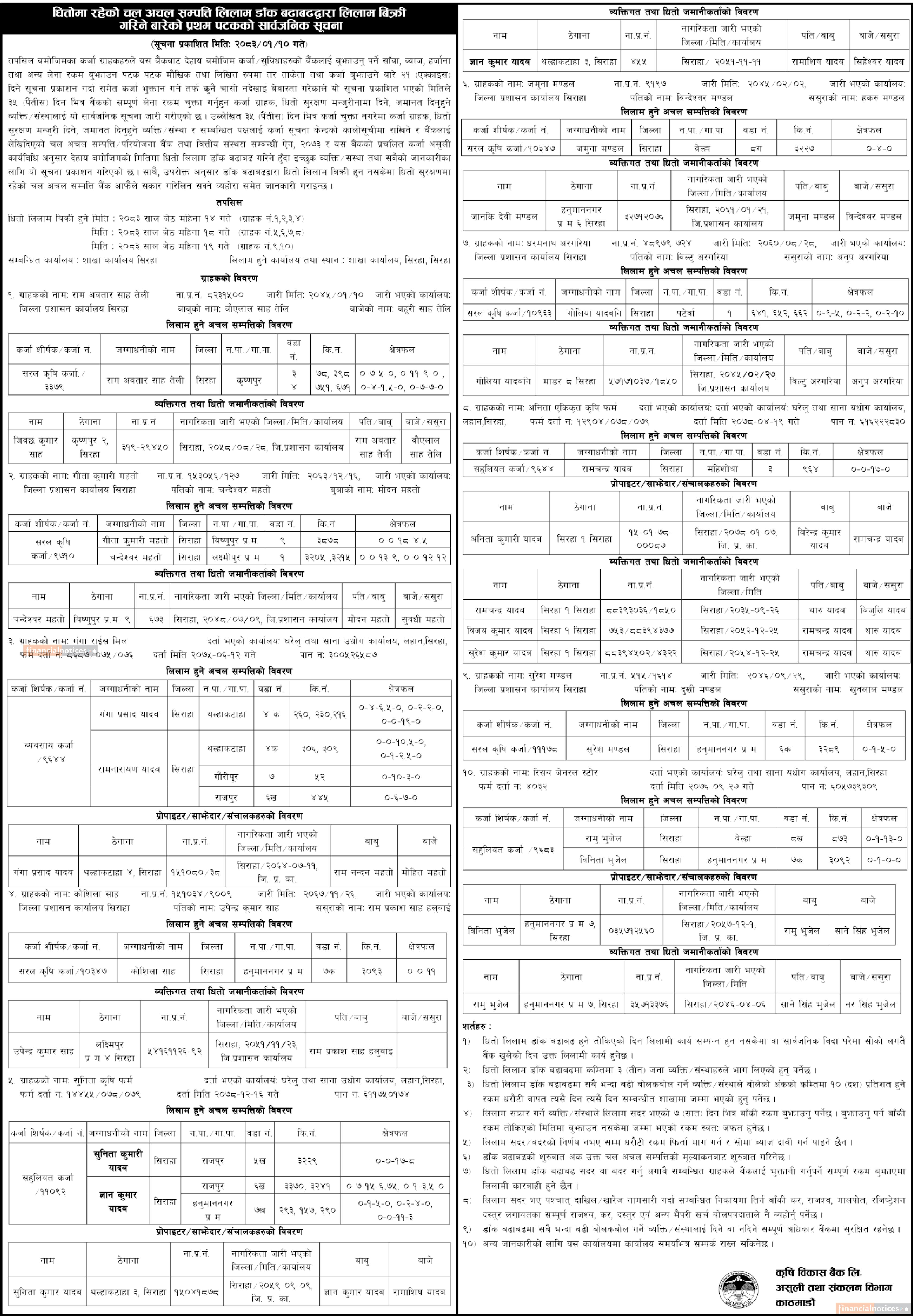 बैंकको विभिन्न शाखा कार्यालयमा धितो सुरक्षणमा रहेको सम्पत्ति लिलाम बिक्रीको १५ दिने सूचना