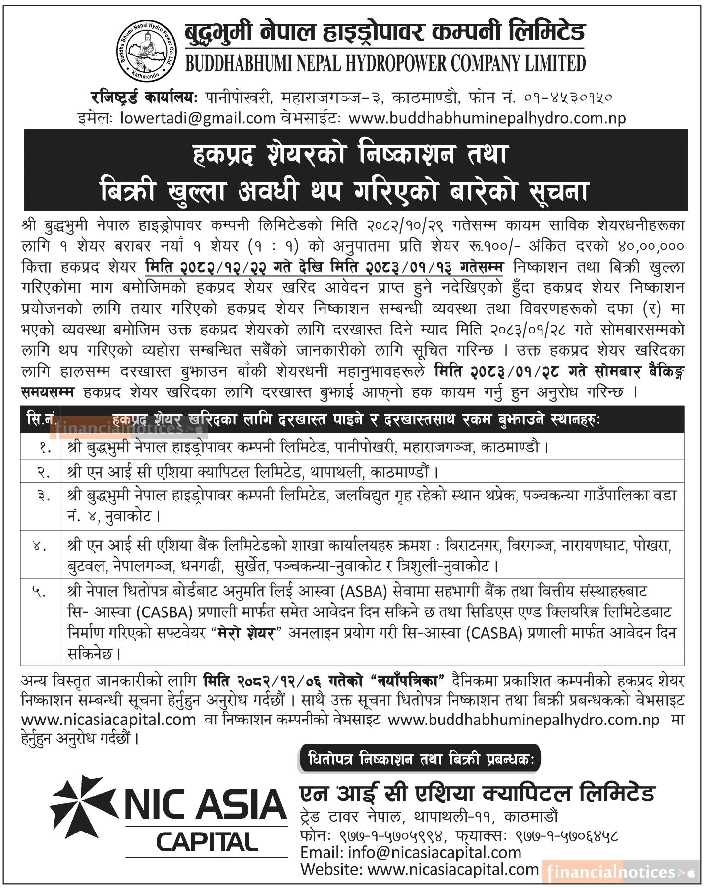 बुद्धभुमी नेपाल हाइड्रोपावरको हकप्रद शेयरमा आवेदन दिने अवधि थप गरिएको बारे सूचना