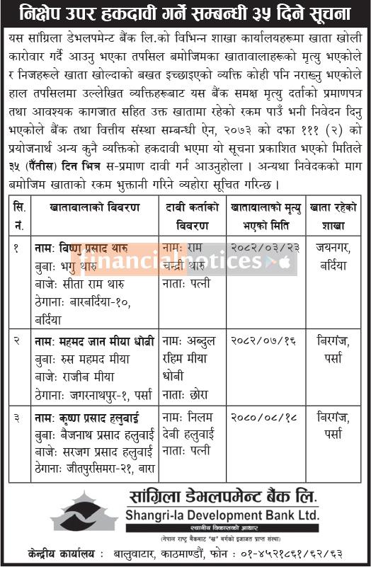 निक्षेप उपर हकदावी गर्ने सम्बन्धी सूचना