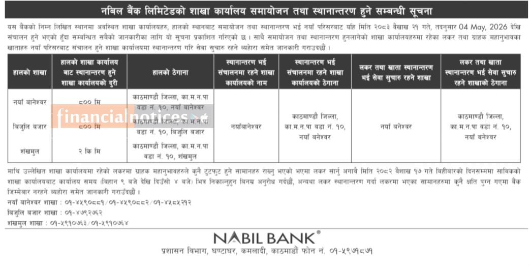 नबिल बैंकको शाखा समायोजन तथा स्थानान्तरण सम्बन्धी सूचना