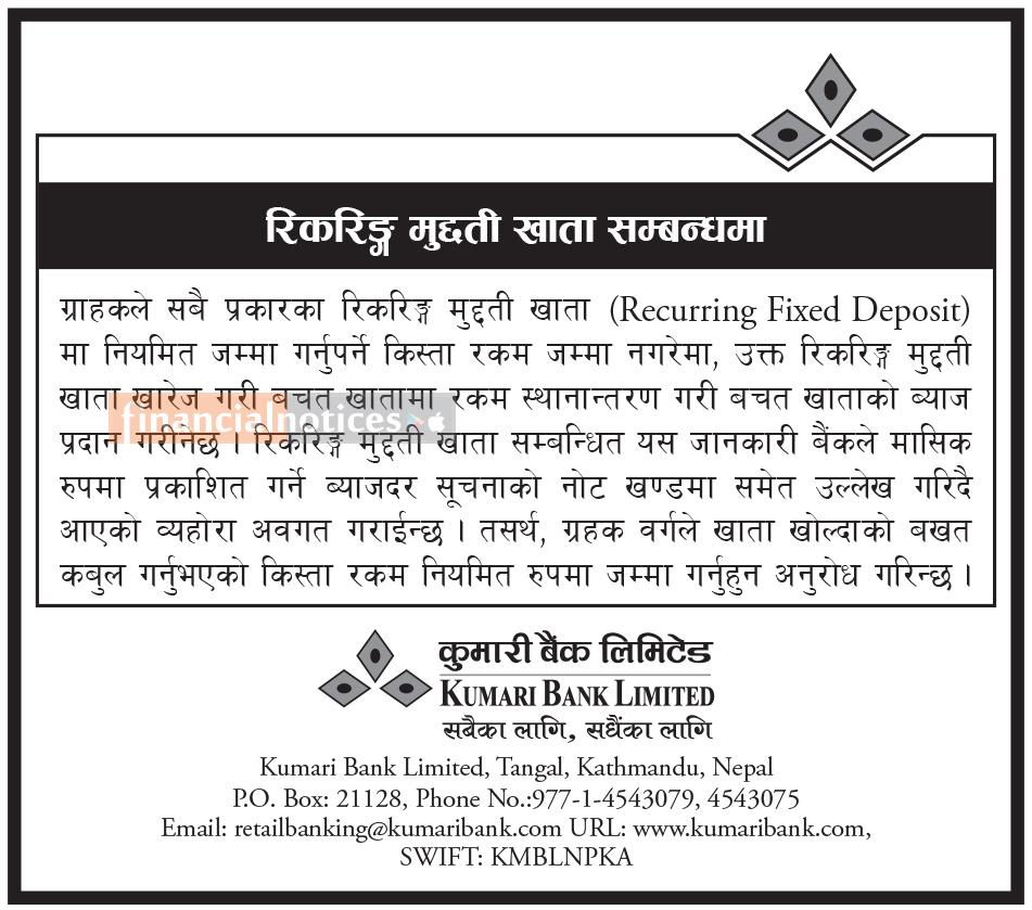 रिकरिङ मुद्दती खाताधारकका लागि सूचनाः नियमित किस्ता अनिवार्य, नत्र खाता खारेज हुने बारे सूचना