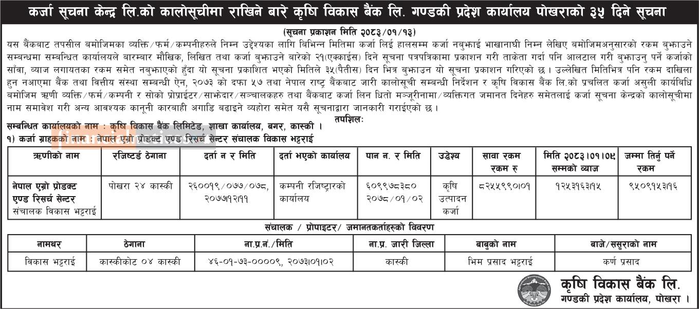 कालो सूचीमा राखिने बारे कृषि विकास बैंकको सूचना