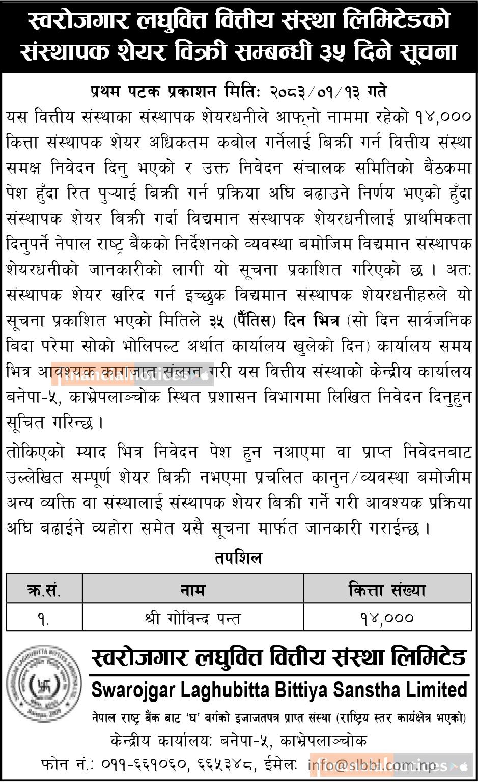 १४ हजार कित्ता संस्थापक शेयर बिक्री सम्बन्धी ३५ दिने सूचना