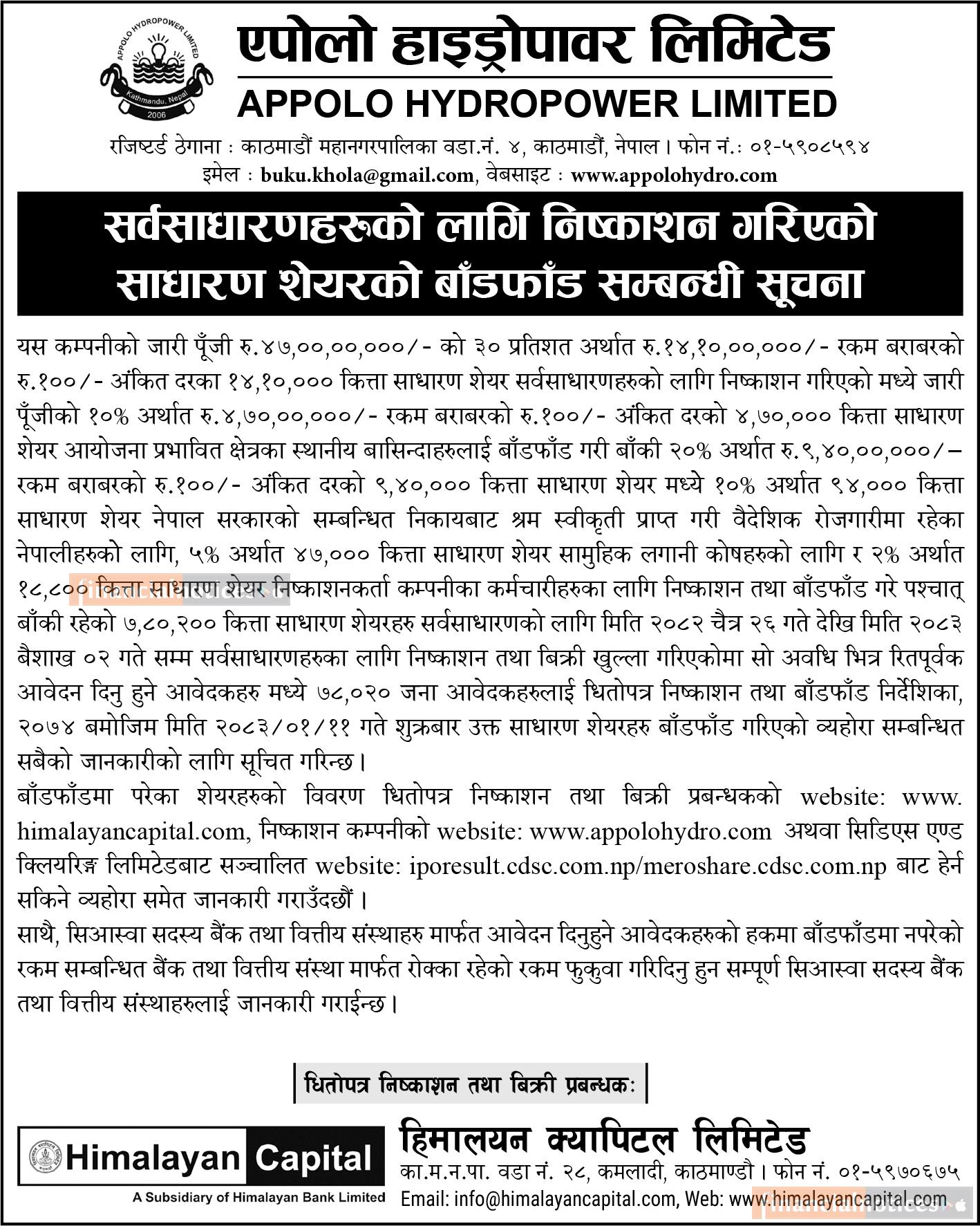 सर्वसाधारणलाई निष्काशित एपोलो हाइड्रोपावरको आईपीओ बाँडफाँट सम्बन्धी सूचना