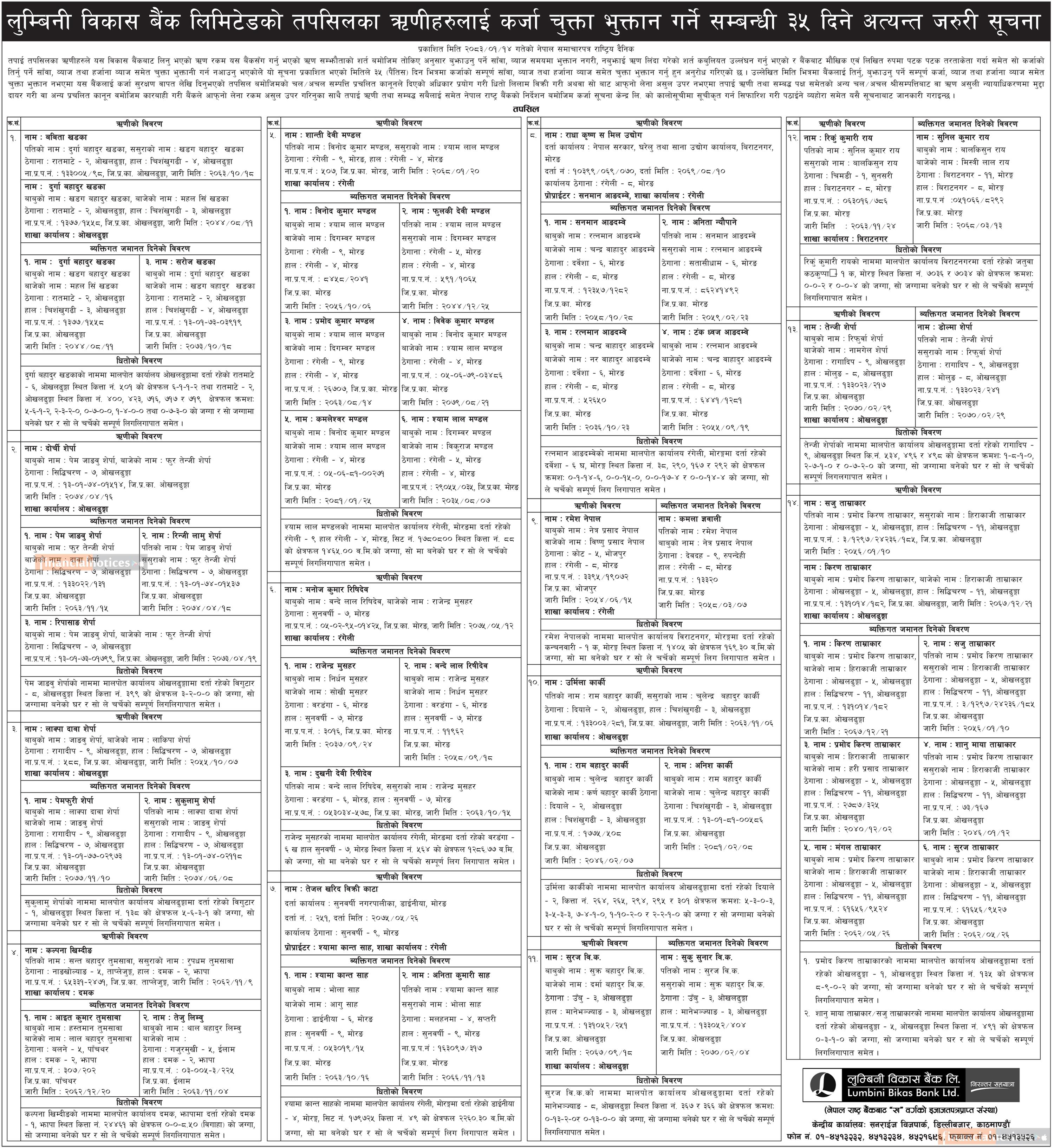 लुम्बिनी विकास बैंकको ऋणीहरुलाई कर्जा चुक्ता भुक्तान गर्ने सम्बन्धी ३५ दिने सूचना