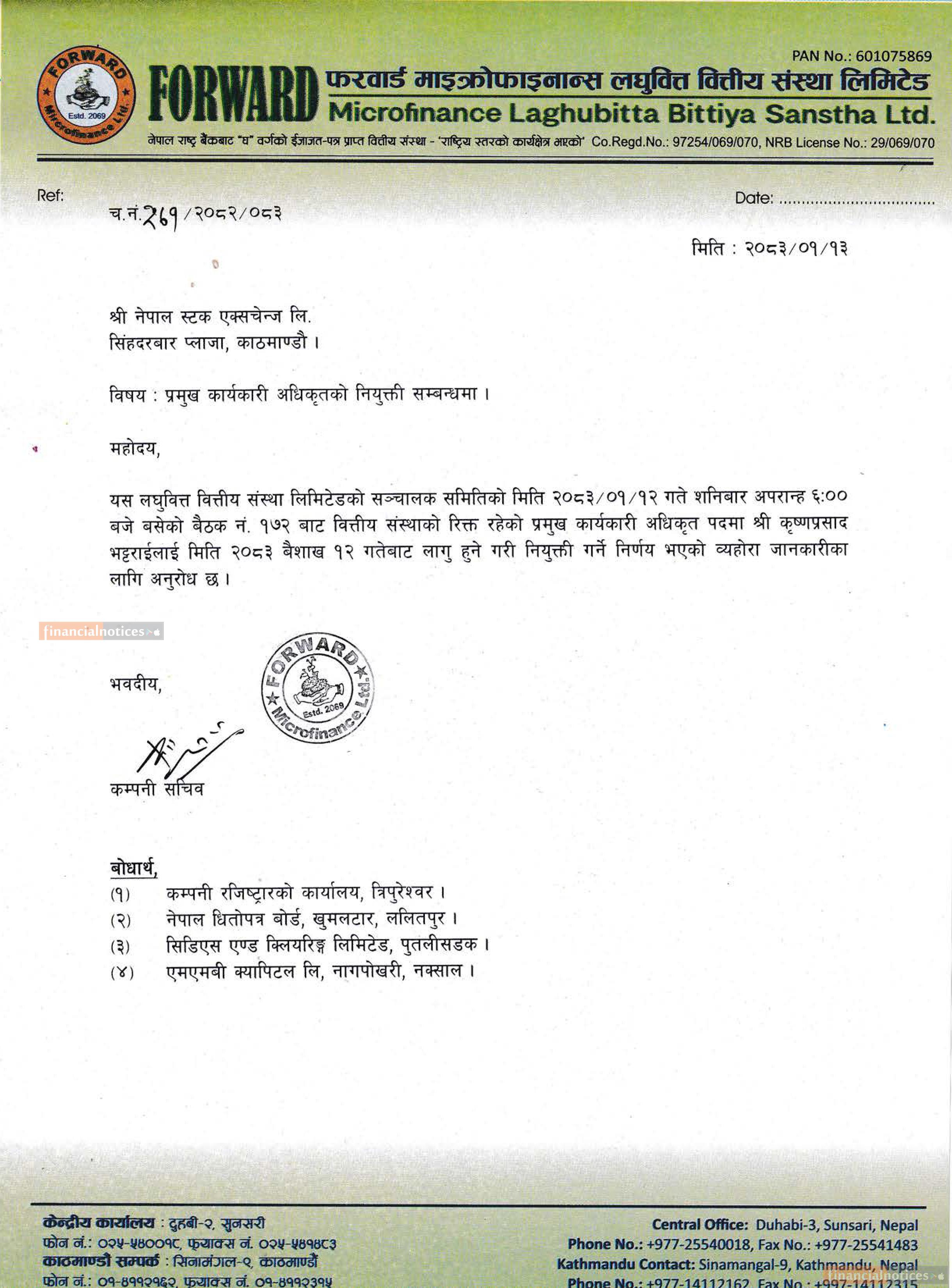 फरवार्ड माइक्रोफाइनान्स लघुवित्तको सीईओमा कृष्णप्रसाद भट्टराई नियुक्त बारे सूचना