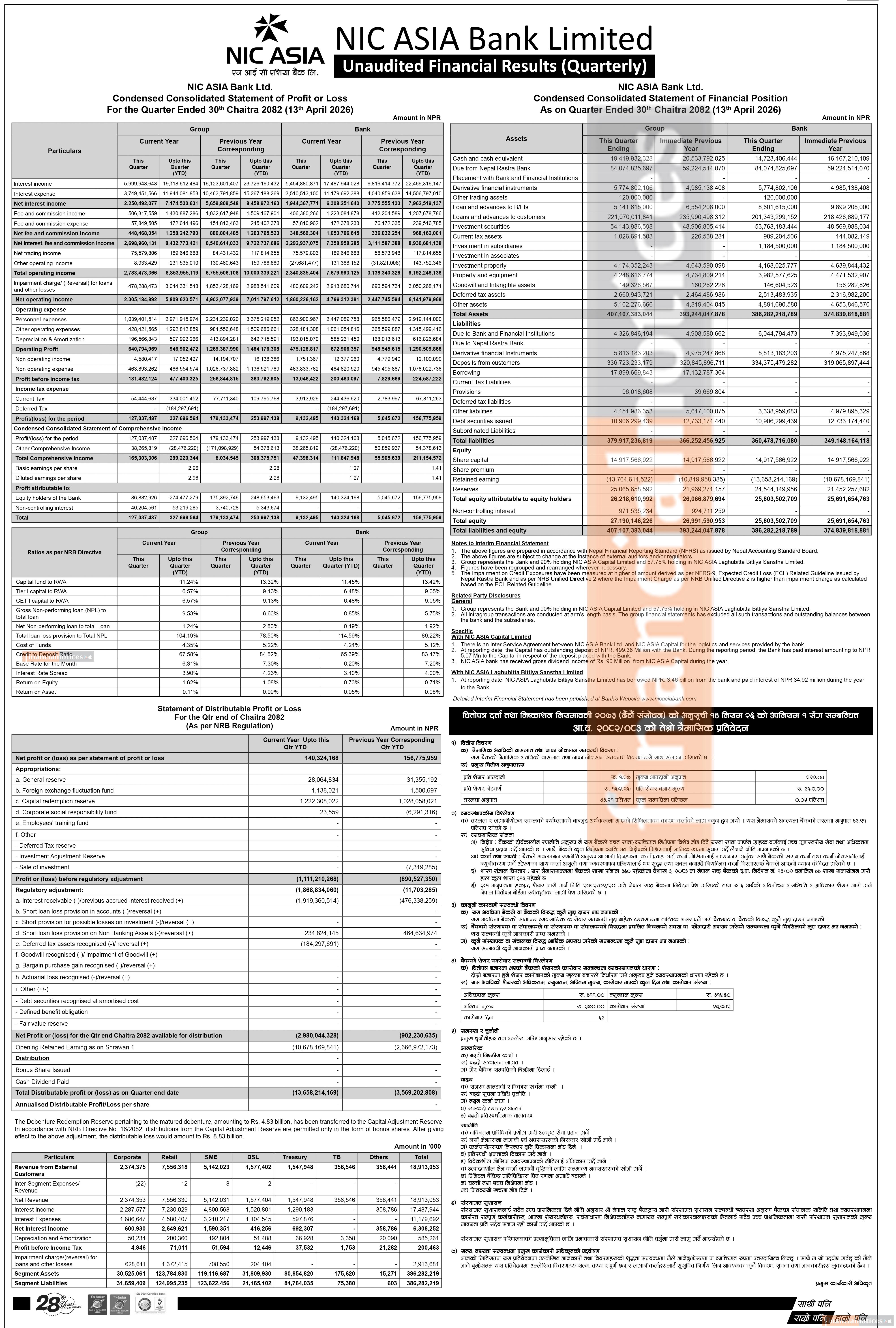 समग्रमा, एनआईसी एशिया बैंकको वित्तीय अवस्थाले उच्च प्रोभिजनिङमार्फत जोखिम नियन्त्रणको प्रयास देखाए पनि नाफा, आम्दानी र कर्जा विस्तारजस्ता प्रमुख सूचकहरूमा दबाब कायम रहेको संकेत गर्छ।