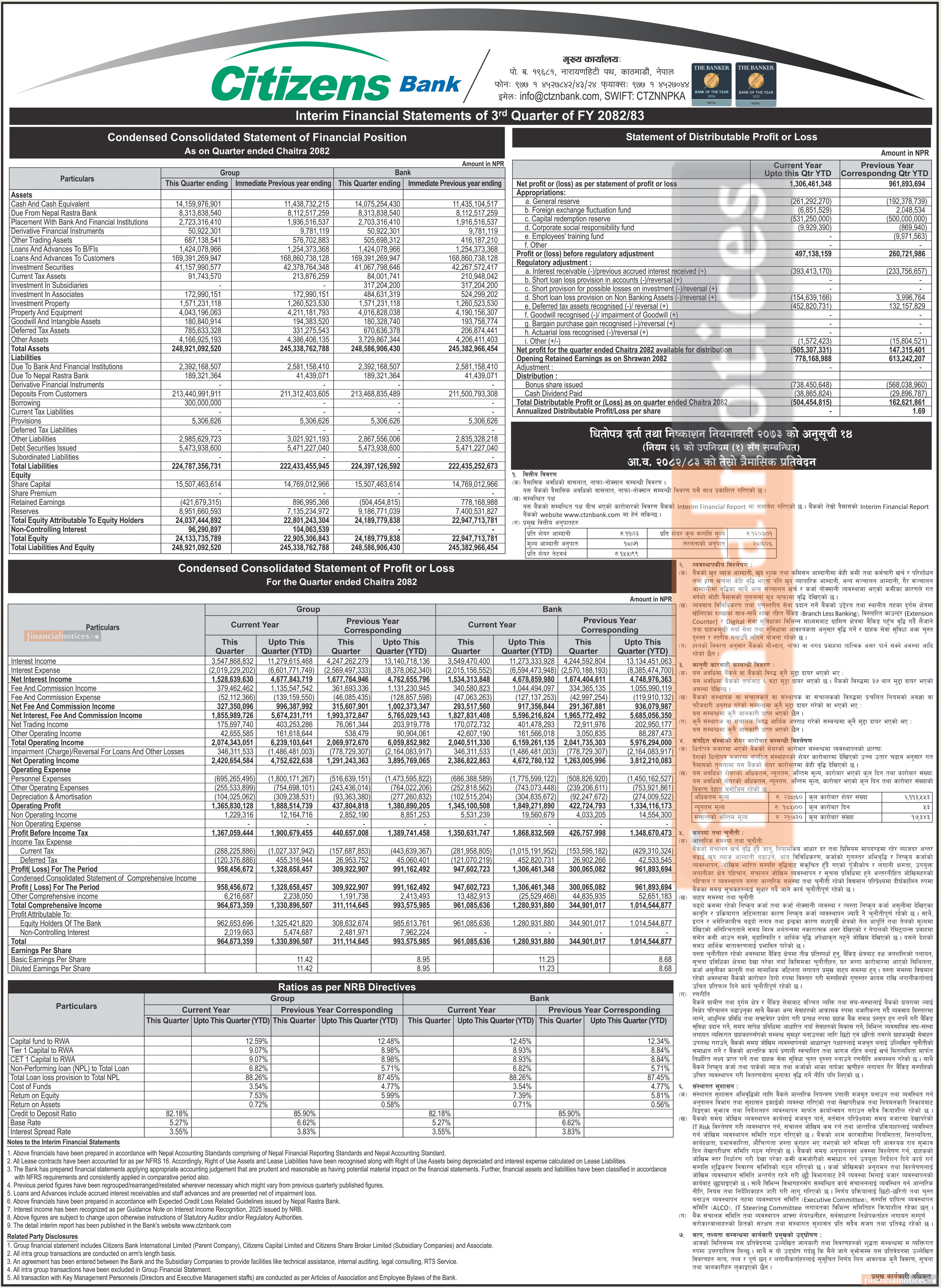 Citizens Bank earns Rs 1.30 billion, releases third-quarter financial analysis