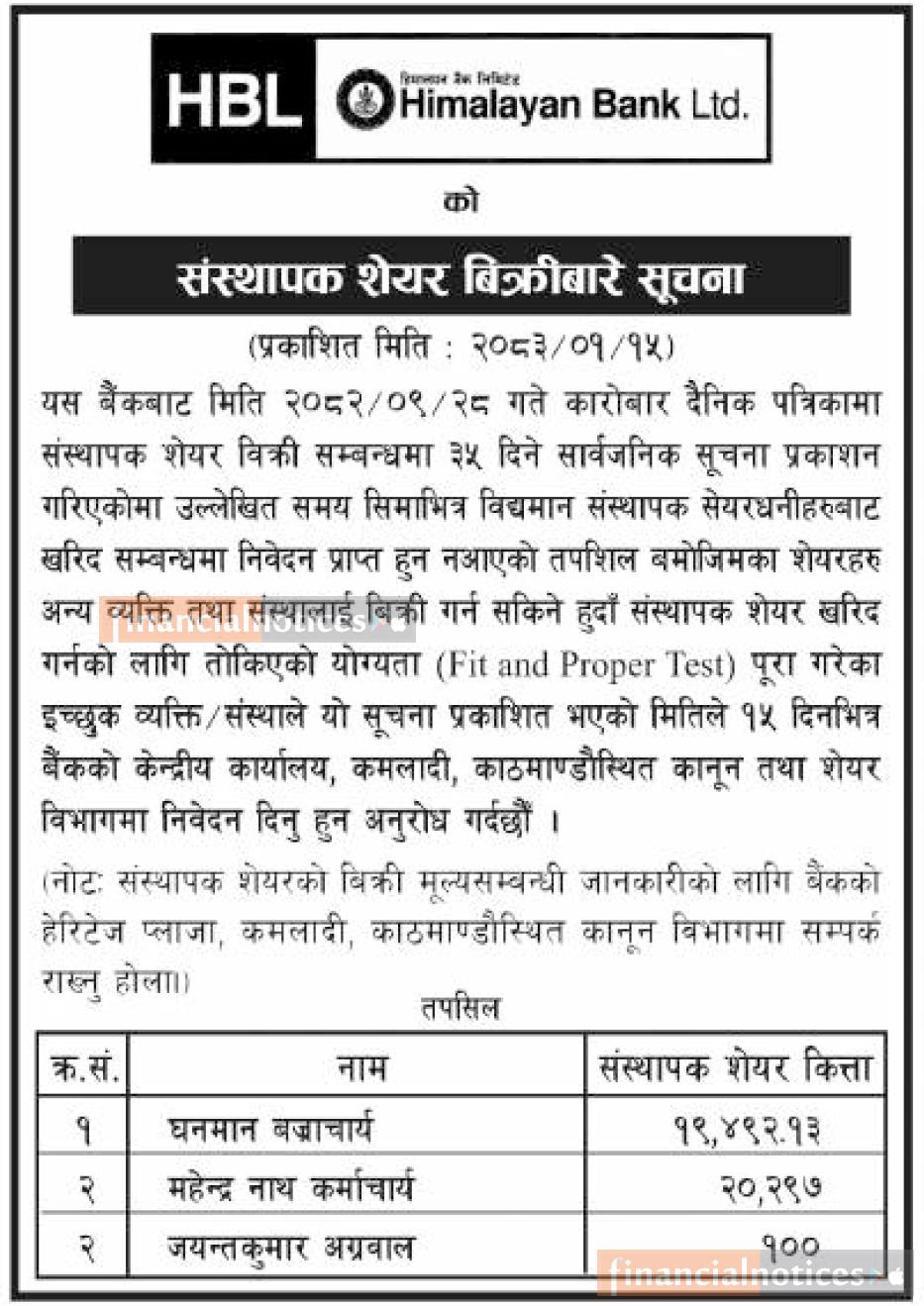 संस्थापक शेयर बिक्री बारे हिमालयन बैंकको सूचना