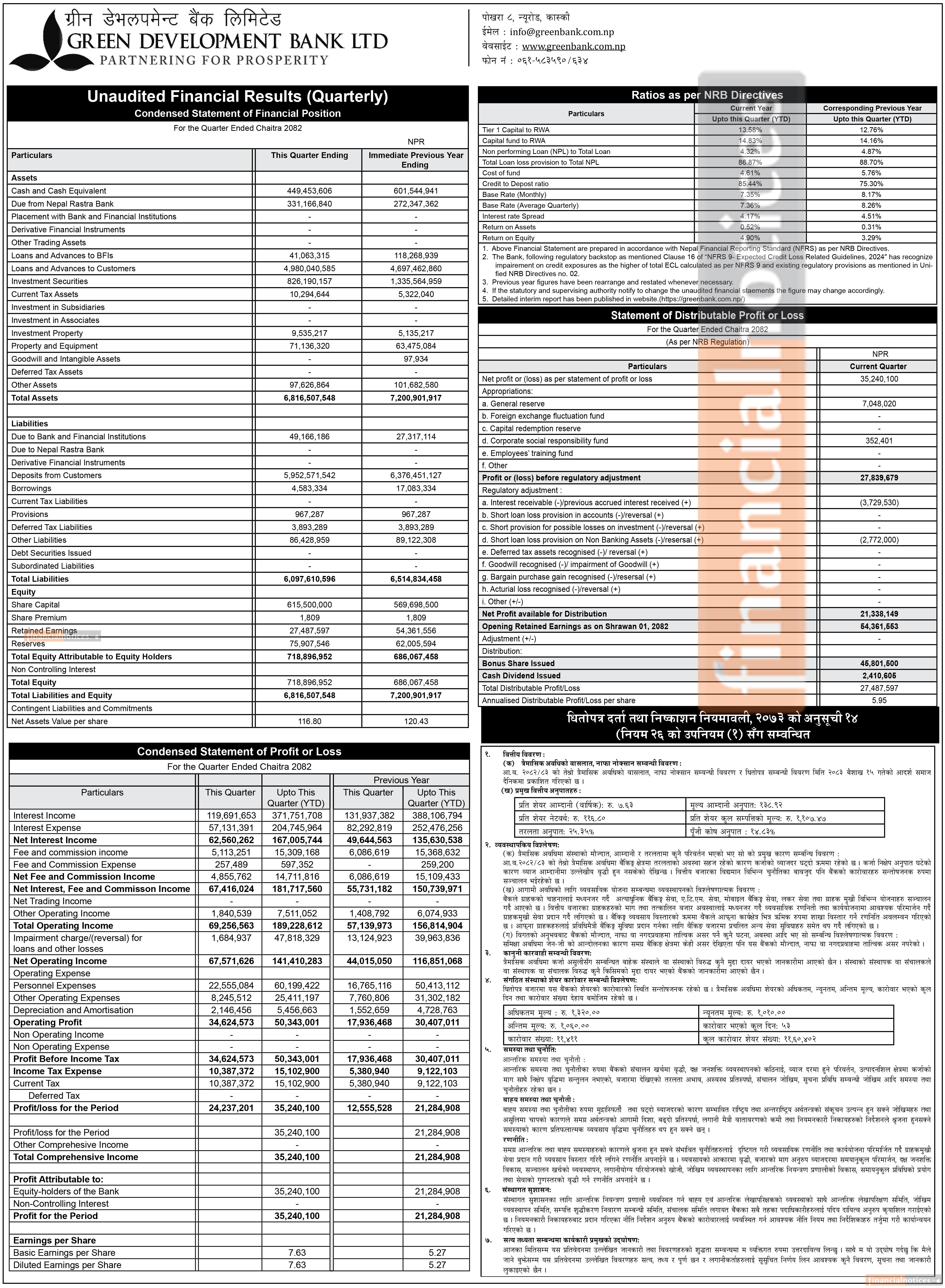 Greeen Development Bank Posts Rs 35.24 Million Net Profit in Q3 FY 2082/83 -