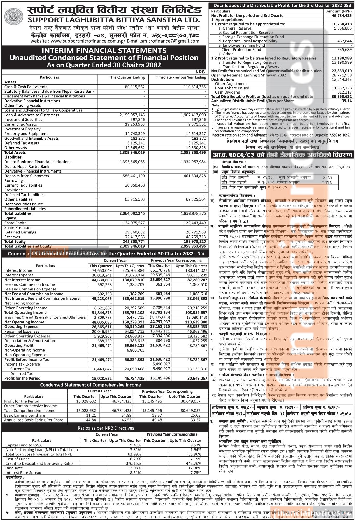 Support Laghubitta posts Rs 46.78 Million Net Profit in Q3 FY 2082/83 -