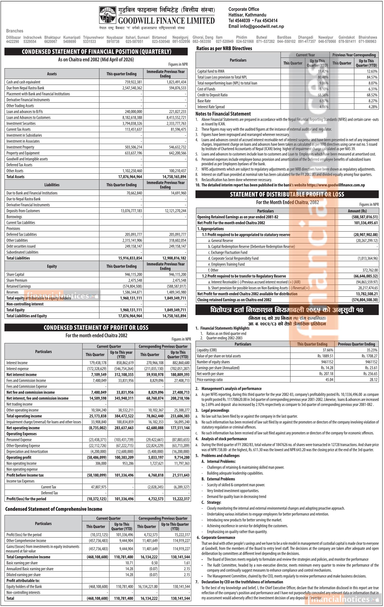 Goodwill Finance Limited Reports Rs. 101.33 million Net Profit in Q3 FY 2082/83 -