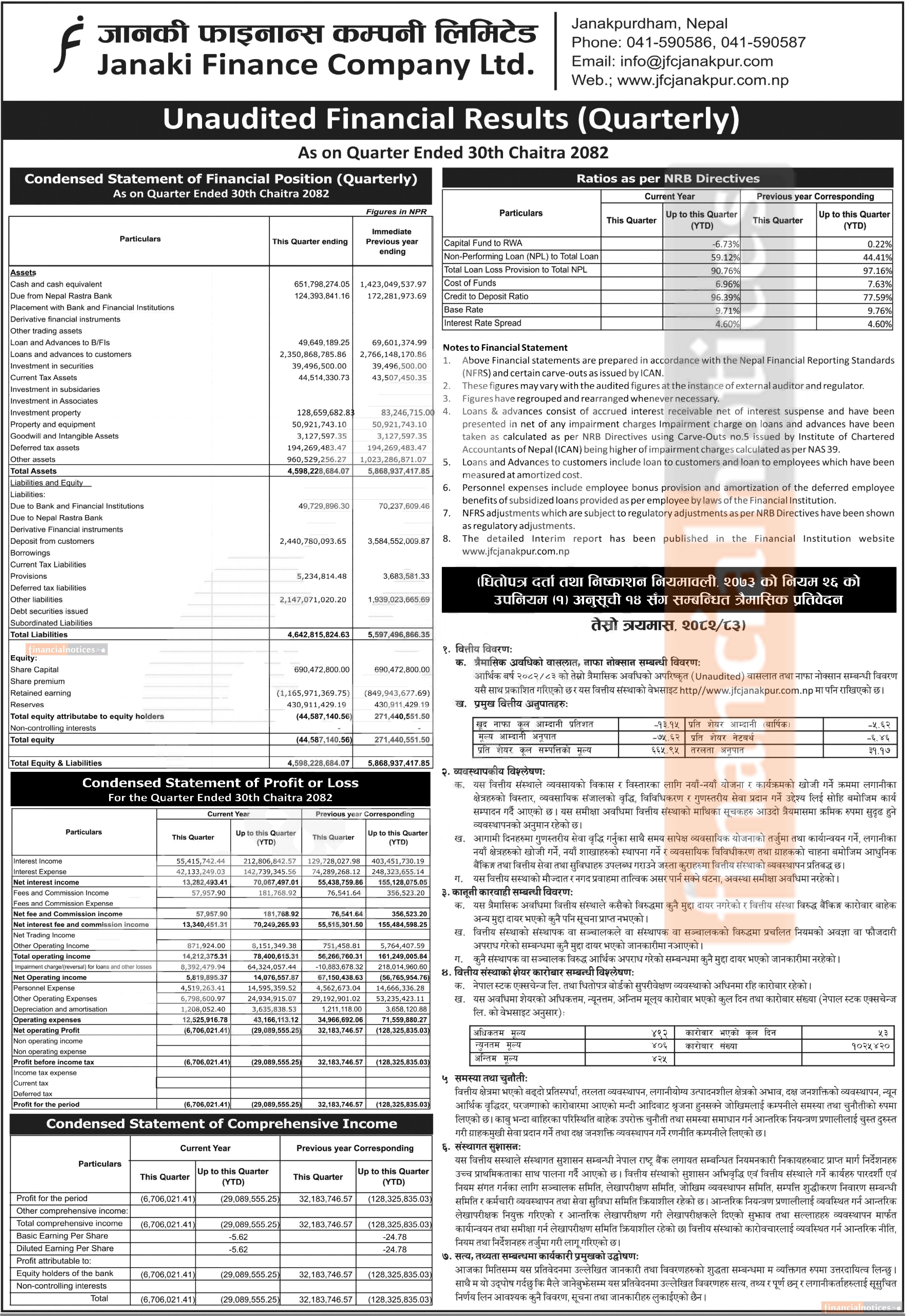 Janaki Finance Limited Reports Rs. 29.08 million Net loss in Q3 FY 2082/83 -