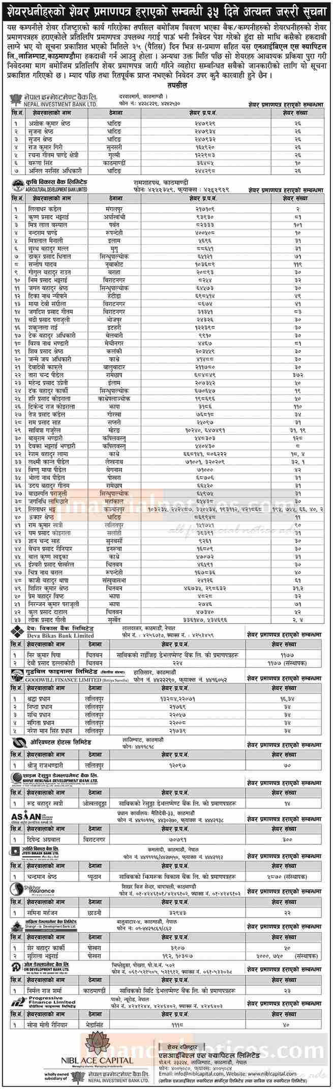 शेयर प्रमाणपत्र हराएको सम्बन्धी सूचना