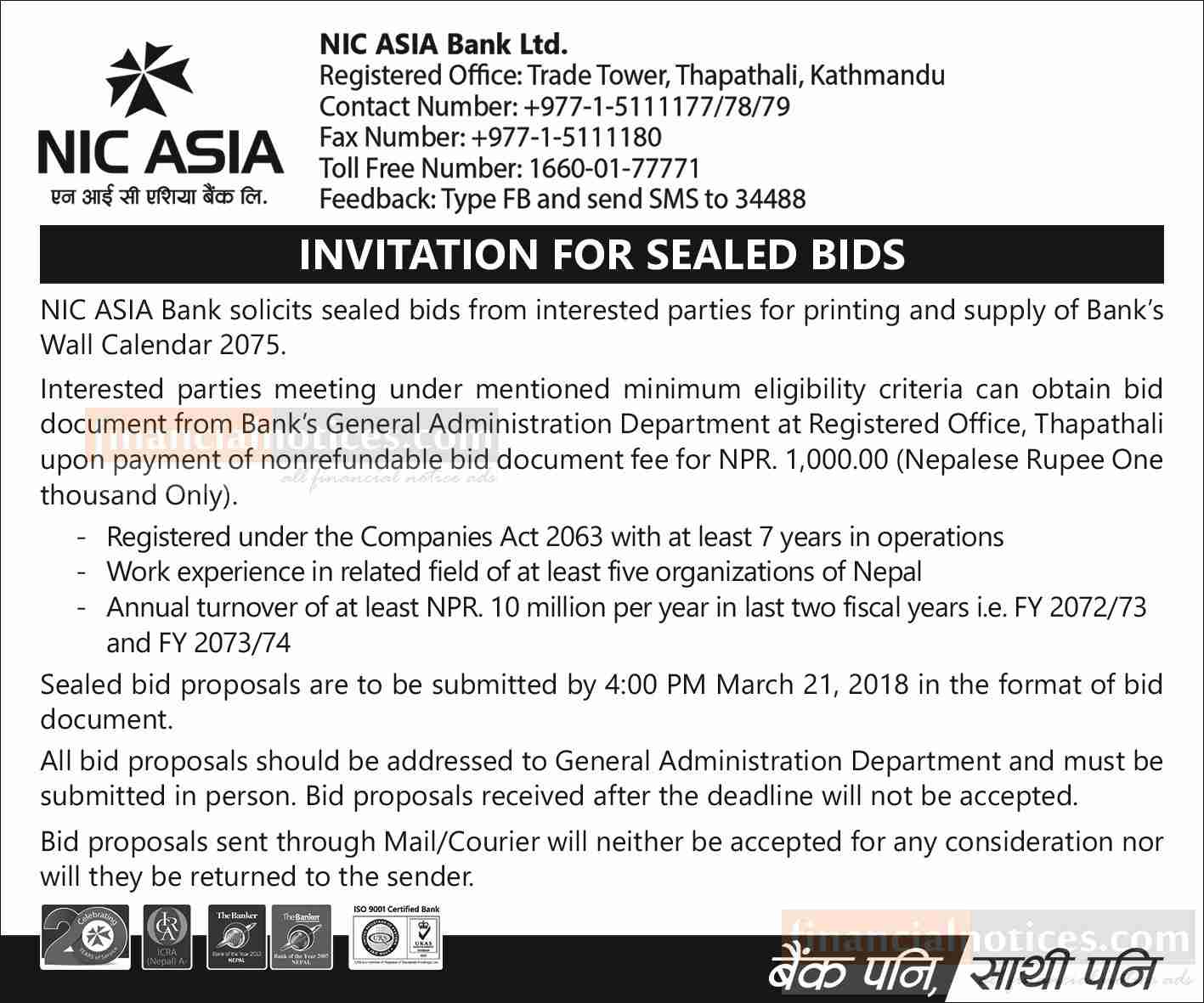 Invitations for Sealed Bids for Bank’s Wall Calendar