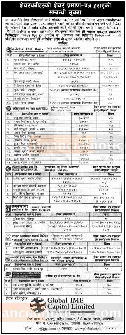 शेयर प्रमाणपत्र हराएको सम्बन्धी सूचना