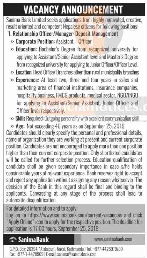 सानीमा बैंकमा नयाँ रोजगारीको अवसर