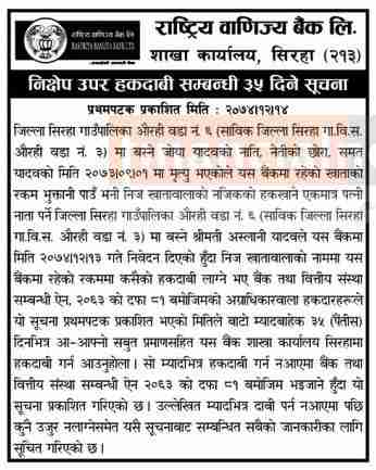 निक्षेप उपर हकदावीको सूचना