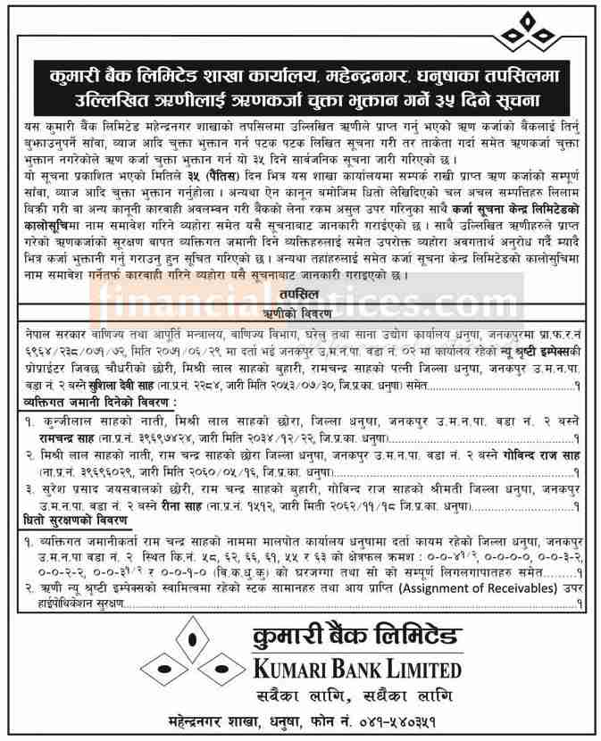 Kumari Bank Auction Notice for Non-Banking Assets at Mahendranagar, Kanchanpur -