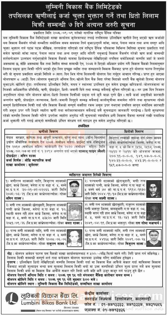 Kumari Bank Auction Notice for Non-Banking Assets at Mahendranagar, Kanchanpur -