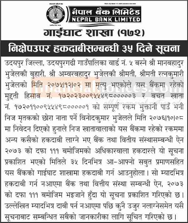 निक्षेप उपर हकदावी सम्बन्धी सूचना