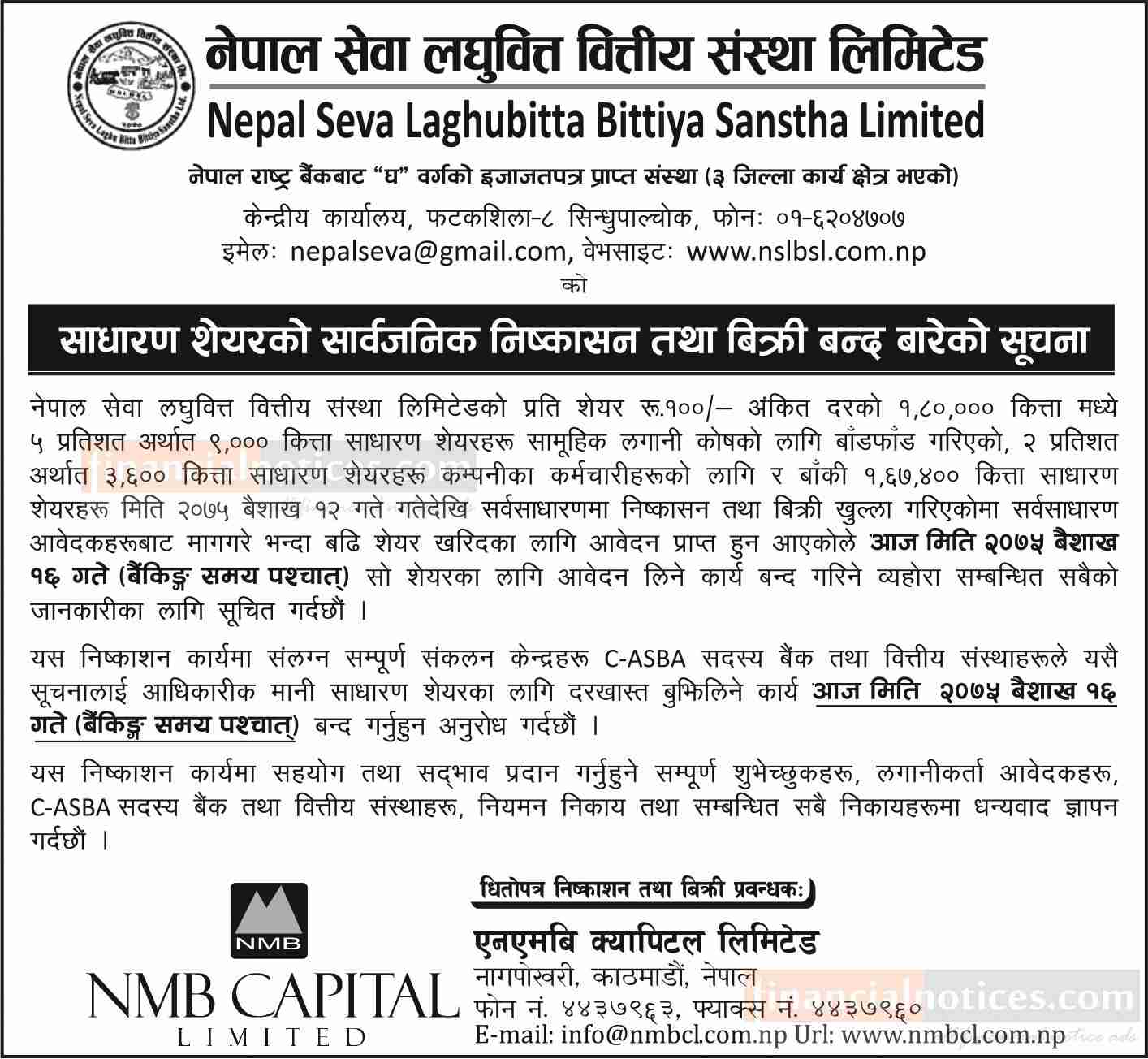 साधारण शेयरको सार्वजनिक निश्कासन तथा विक्रि बन्द बारेको सूचना !!!