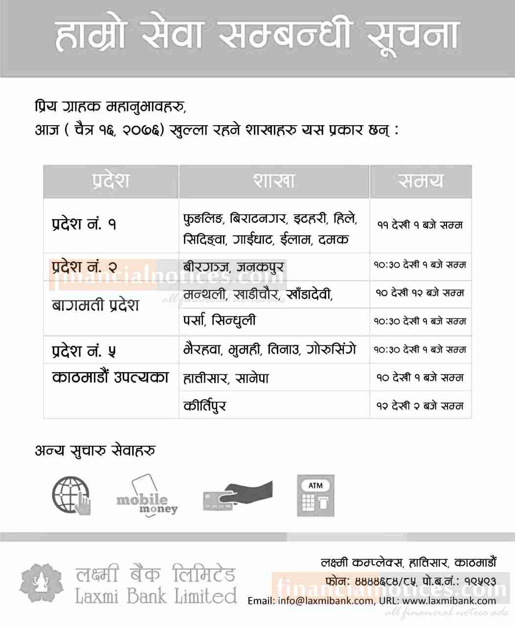 लक्ष्मी बैंकको सेवा सम्बन्धी सूचना