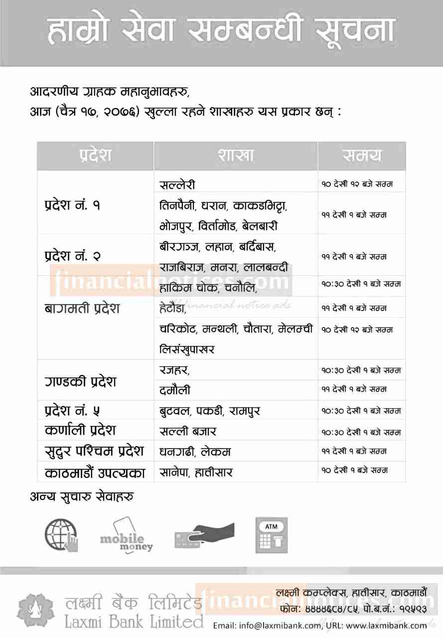 लक्ष्मी बैंकको सेवा सम्बन्धी सूचना