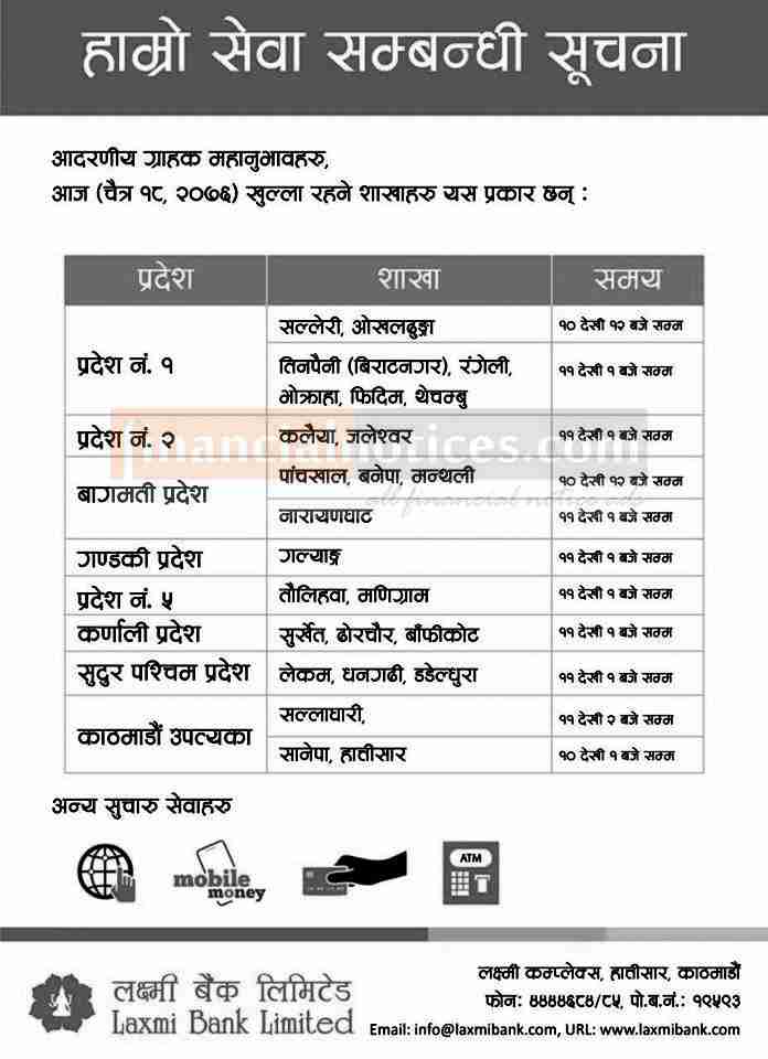 लक्ष्मी बैंकको सेवा सम्बन्धी सूचना