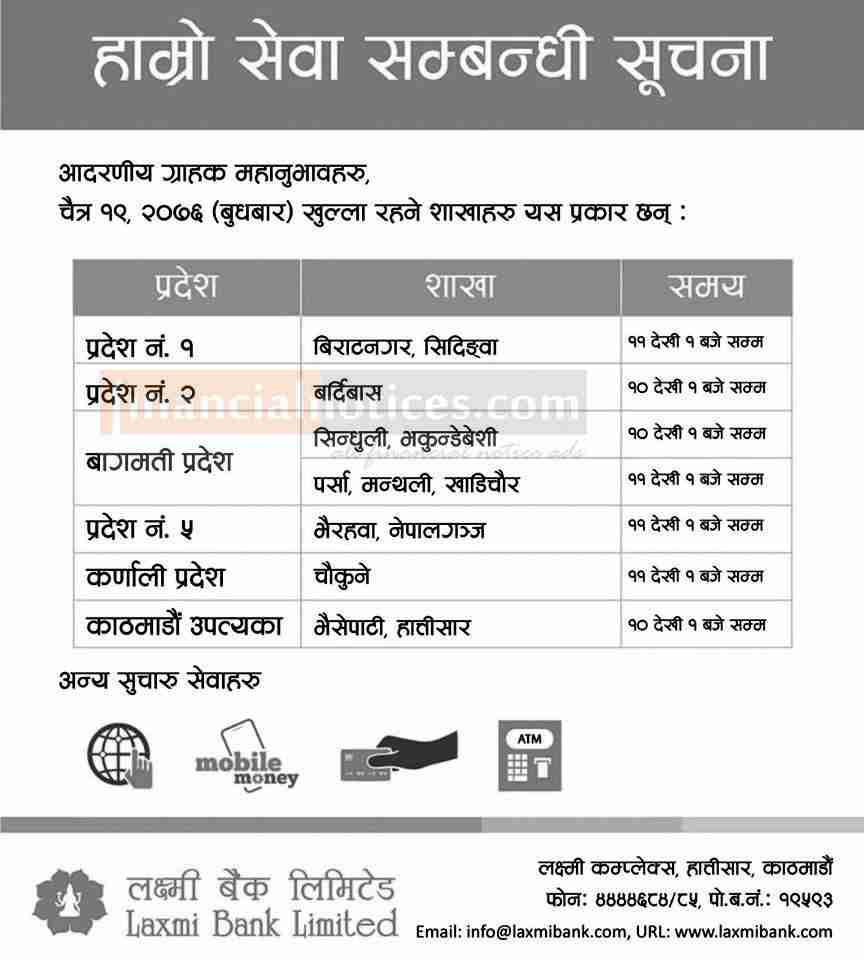 लक्ष्मी बैंकको सेवा सम्बन्धी सूचना