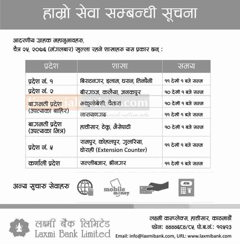 लक्ष्मी बैंकको सेवा सम्बन्धी जानकारी