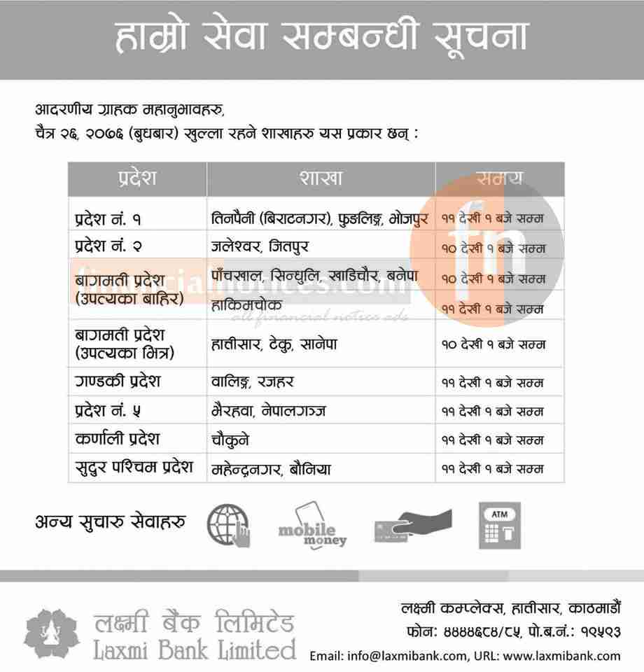 लक्ष्मी बैंकको सेवा समयबारे जानकारी