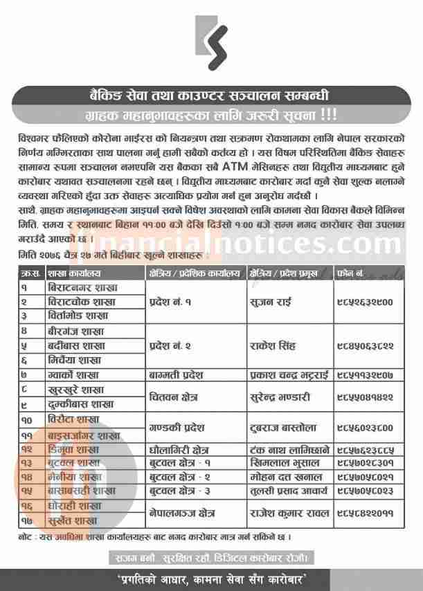 बैंकिङ सेवा तथा काउन्टर संचालनको सूचना