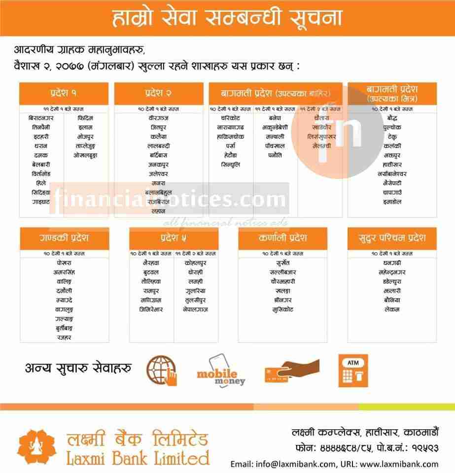 लक्ष्मी बैंकको मंगलबार खुल्ला रहने शाखाहरु