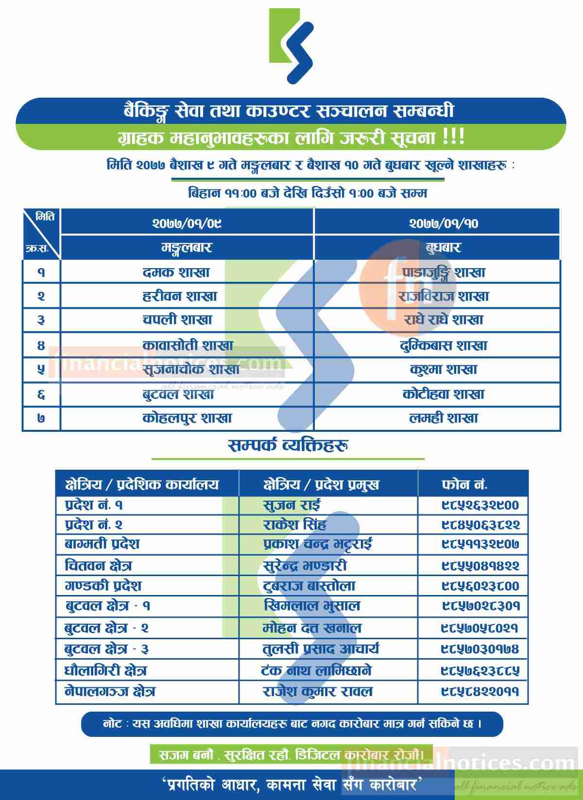 कृषि विकास बैंककाे शाखा कार्यालय खुल्ला रहने बारेकाे सूचना -