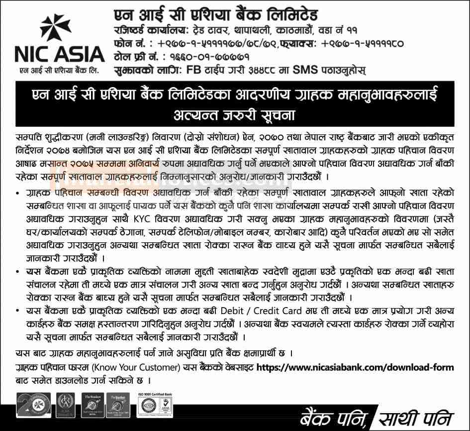 NIC ASIA बैंकको अत्यन्त महत्वपूर्ण सूचना !